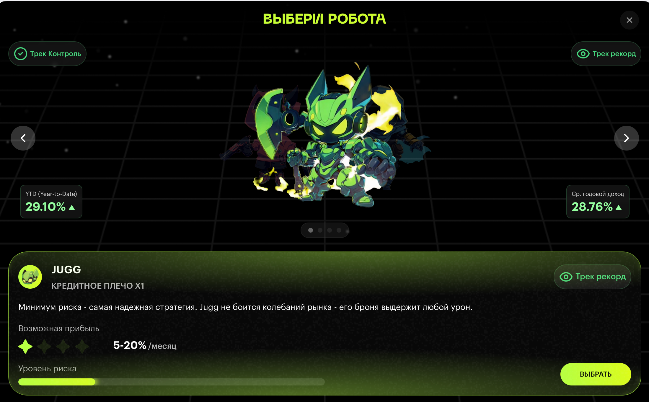 After successfully funding your balance, you can proceed to choose a trading robot. Bitronix offers 4 algorithmic strategies with different risk and return profiles, allowing you to select the option that aligns with your goals.