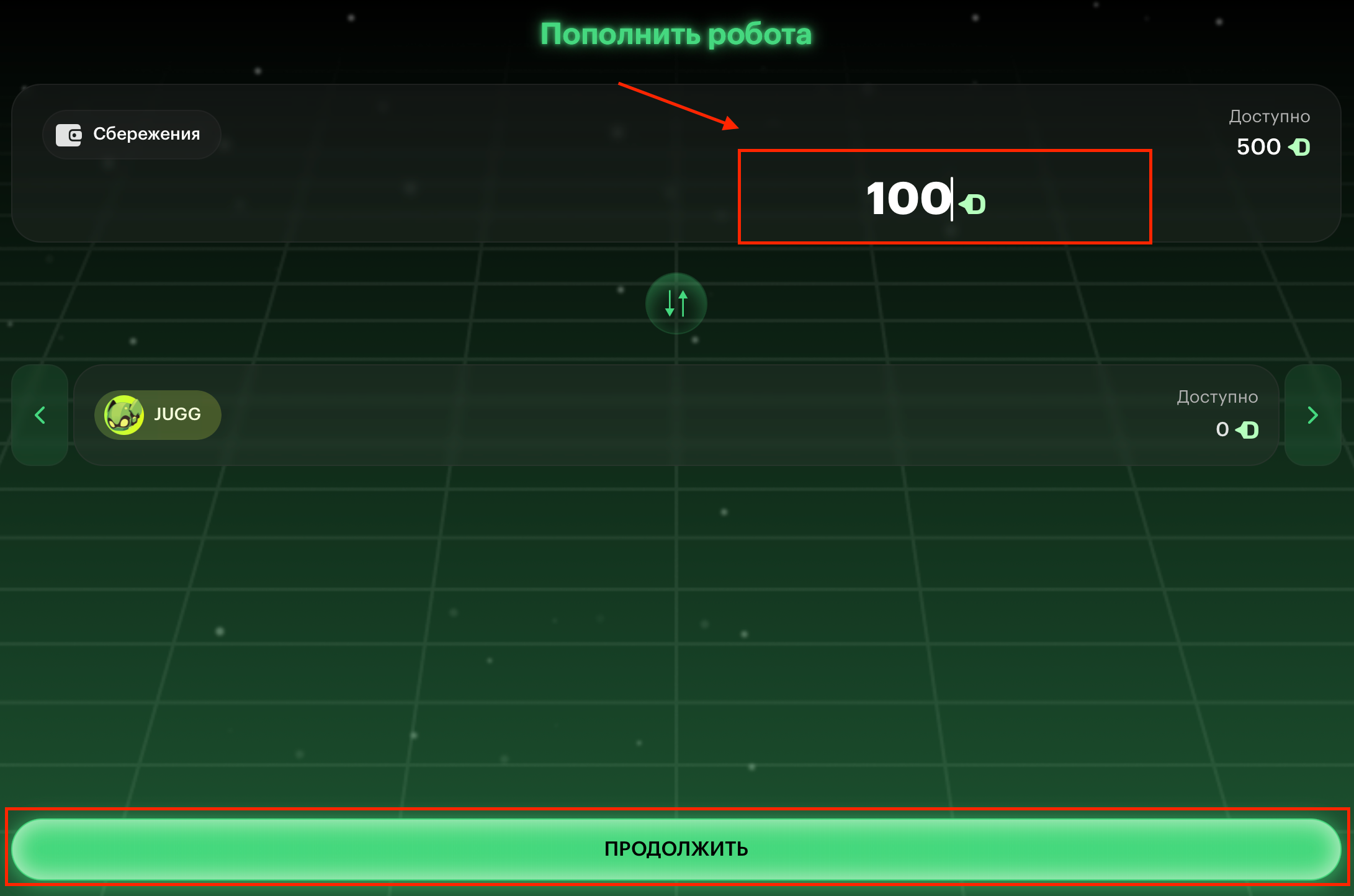 On the opened "Fund Robot" screen, specify the amount you want to allocate for trading.